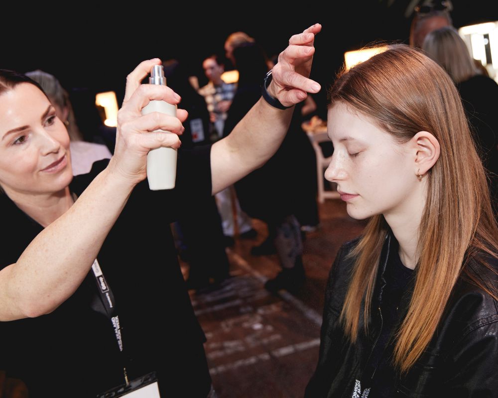 The Tranquillity Water Activating Mist by Raaie emerged as the backstage hero. Led by Head Makeup Artist Josie Wignall, the beauty direction for Juliette Hogan’s show – aptly named Radiance Refined – leaned heavily on the mist’s volcanic thermal water and botanicals. Models’ skin appeared drenched in hydration, luminous yet effortless, epitomising that elusive “lit-from-within” glow.
