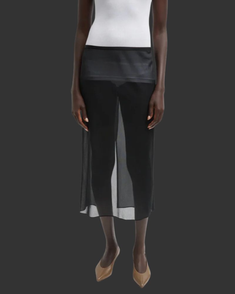 Think of it as contrast dressing: take a midi or maxi sheer skirt and wear it over high-waisted jeans or cropped pants. The underlayer grounds the look, while the sheer overlay gives you movement, shimmer, and drama. Bonus: in cooler weather, the denim gives you warmth while the sheer panels break monotony.