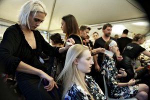 According to Nic Briand of Lover: Our inspiration for the new collection was modern femininity. The hair concept evolved after discussing our collection with Sophie. Its a mix of masculine tailoring and soft feminine float and lace. So we came up with the idea to mix a modern slick side part with a defined pony tail. The perfect compliment to the collection.