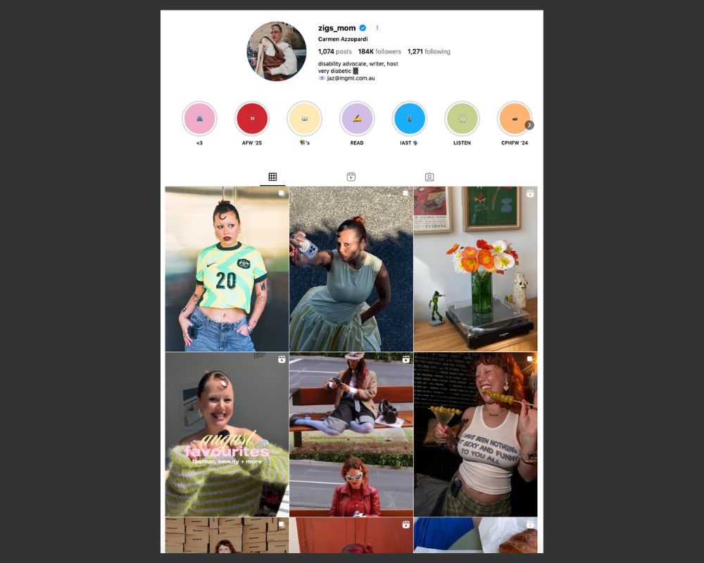 Carmen is the epitome of a cool girl in my opinion. I go to her accounts all the time for inspo as she feels so closely aligned to me. I love her style, her values and her vulnerability around sharing her diabetes journey – she’s someone I think should be on everyone’s following list.