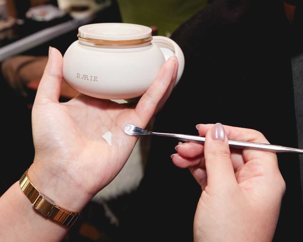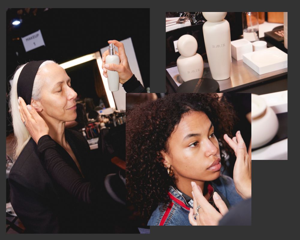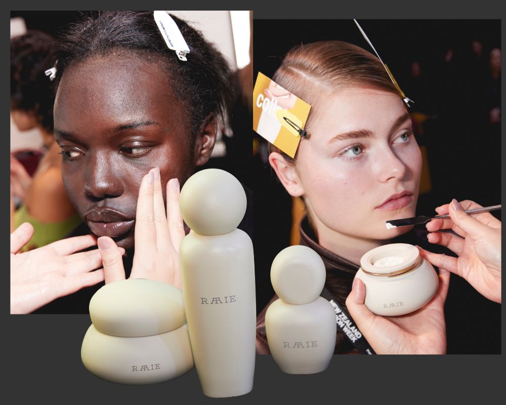 Head Artist Josie Wignall led the beauty direction, describing the final look as “Radiance Refined” — dewy complexions, soft tones, and subtle light play that let Hogan’s designs shine. The mist was supported by RAAIE’s cult essentials: the Morning Dew Vitamin C Serum for brightness and the Cocoon Ceramide Cream for long-lasting nourishment.