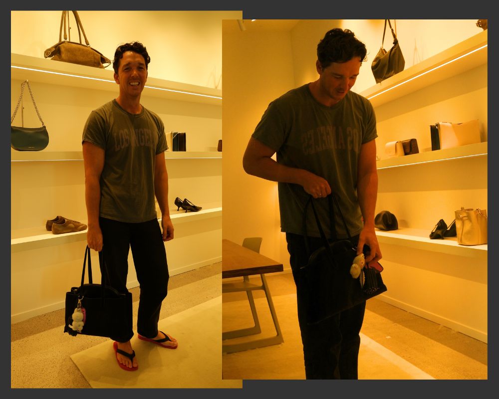 Then there are the charms – an edit of memories clipped to the handle. A prototype leather charm that looks, admittedly, a little BDSM-adjacent. A Labubu picked up while shopping for his niece and nephew. A glittering Miami-stamped charm bought during a holiday phase of “embracing the Miami bling vibe.” And a sample from a collaboration that never eventuated, but survived because he liked it too much to let it disappear.