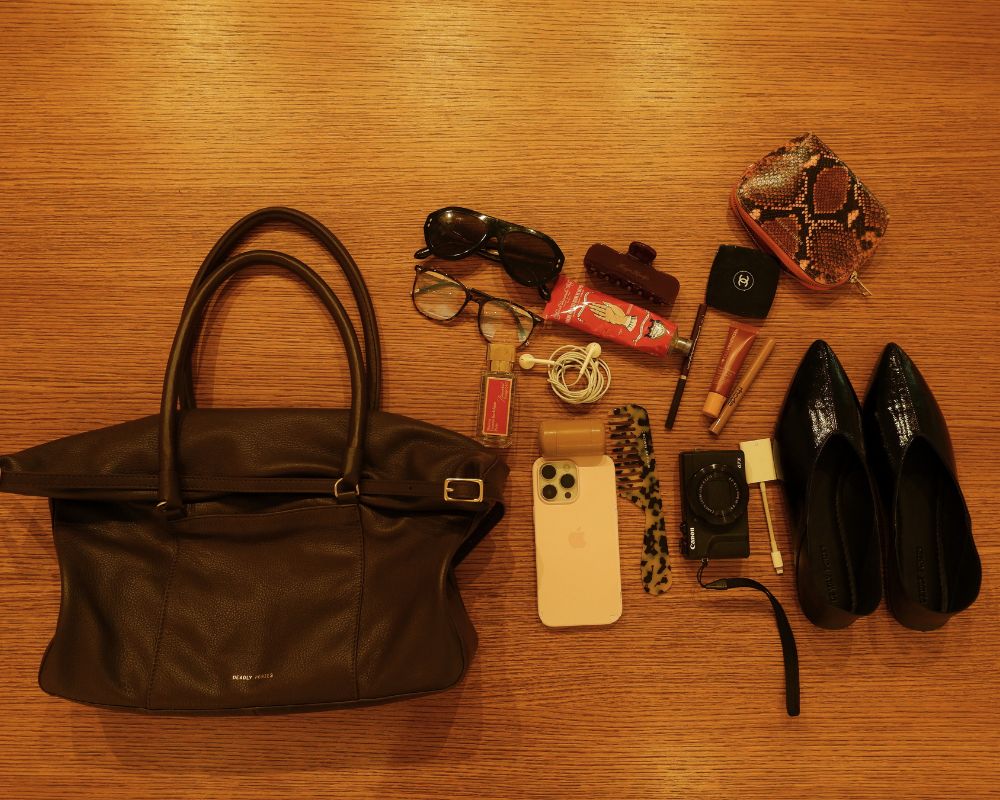 Inside, her world feels beauty-led but entirely practical. A Poucher purchased in her first week at Deadly Ponies when she was still on the retail floor – a small relic of where she started. Her digital camera lives permanently in the bag, along with the essential dongle. “When you’re the friend with the digital camera,” she laughs, “you need to be able to send the photos ASAP.”