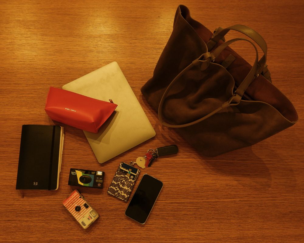 A Poucher Grande in Tamarillo acts as an internal organiser, corralling loose lip glosses, mints, and hand sanitiser. The surprise came in the form of two film cameras she’s been carrying for two weeks, waiting for the right moment – or motivation – to finally get them developed. They’ve become aspirational cargo.